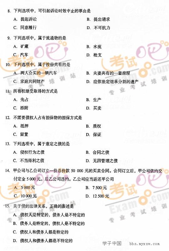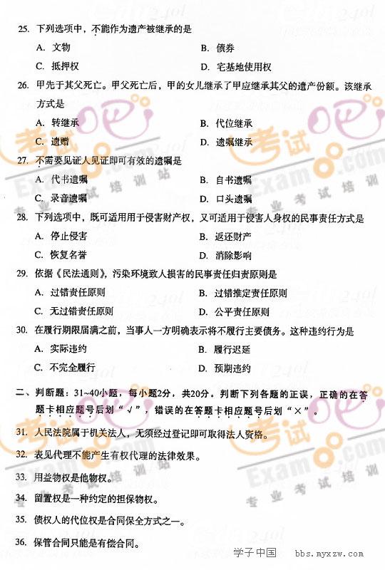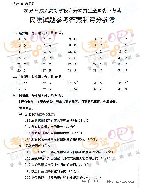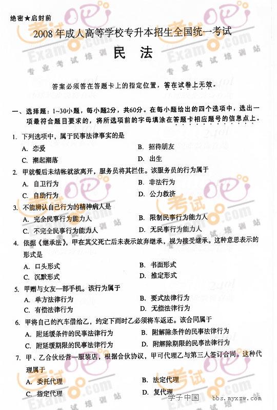 2008成人高考专升本考试(民法)试题及答案2008-11-8 本文被阅读 2743 次