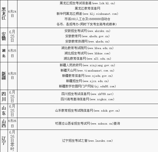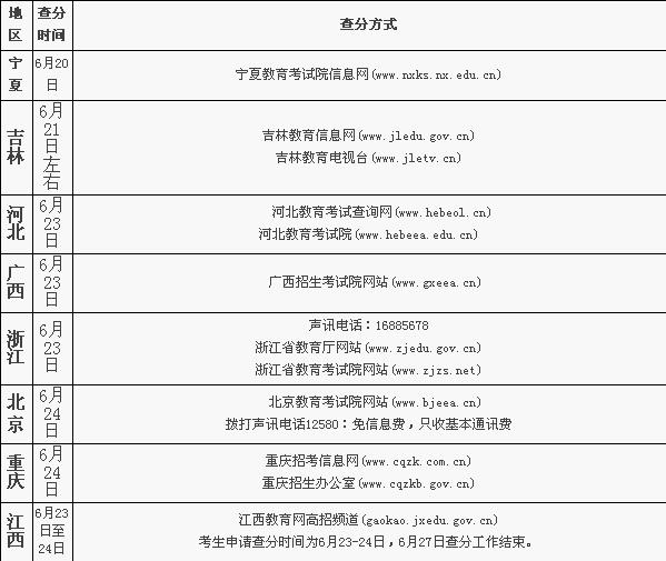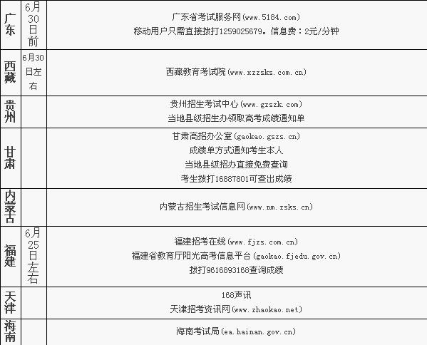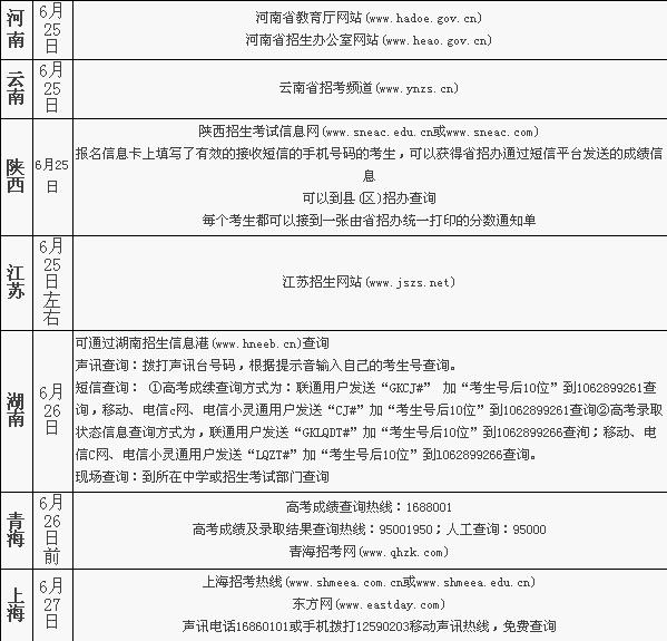 2010全国高校统一招生考试 各地查分时间及方式