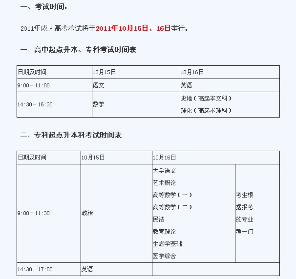 2011年成人高考时间:10月15日、16日2011-5-2 本文被阅读 1859 次