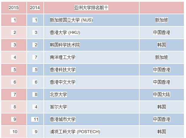 中国香港的香港大学排名上升到第二位,香港科技大学保持第五名,香港中文大学和香港城市大学分列第六名和第九名。